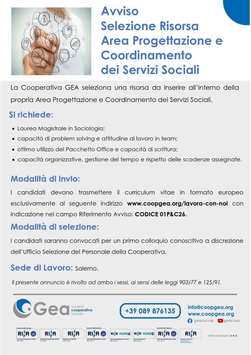 La Cooperativa GEA seleziona una risorsa da inserire all’interno della propria Area Progettazione e Coordinamento dei Servizi Sociali