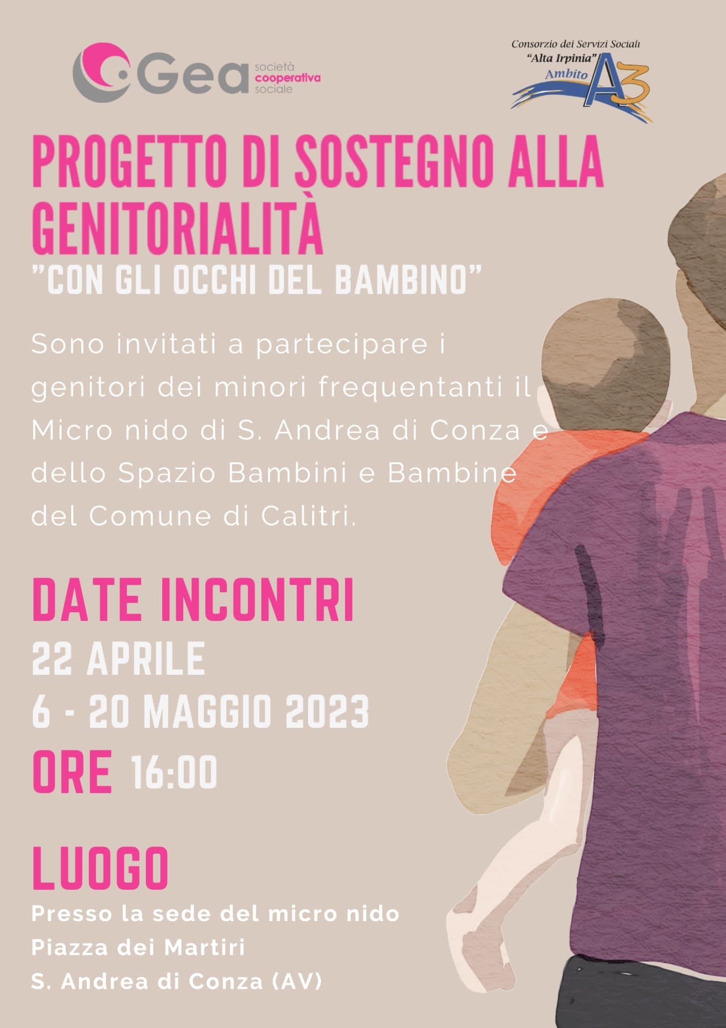 Il progetto ha l’obiettivo di diffondere nuove pratiche educative attraverso lo scambio di esperienze e il coinvolgimento attivo dei genitori. Il progetto sarà effettuato da una psicologa esperta con sei incontri strutturati: si inizia con le famiglie di Sant’Andrea di Conza e Calitri il 22 aprile e 6 e 20 maggio, si prosegue con le famiglie di Lioni, Bisaccia, Bagnoli Irpino, Caposele, Nusco e Torella dei Lombardi i 9, 23 e 30 maggio.
